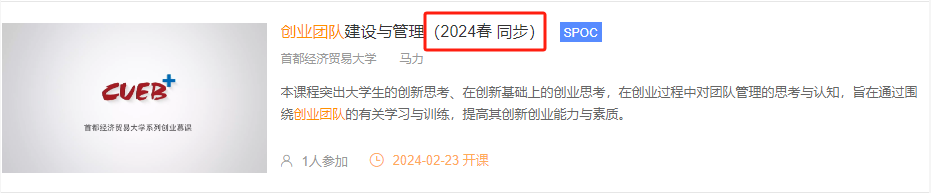①在中国大学MOOC平台(//www.icourse163.org/)中搜索“创业团队建设与管理”。毕业生加入带有“(2024春 异步)”字样的课程,其他同学需同时加入源课程和带有“(2024春 同步)”字样的课程。具体如下方图片所示。